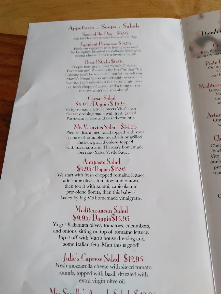 Don't miss out on tempting sauce sides like the Pesto Sauce for $1.50 or Hot Honey for a kick of sweetness. And why not take home a piece of Vito’s with a stylish T-shirt ranging from $24 to $25, perfect for those who want to flaunt their love for this fantastic pizzeria?